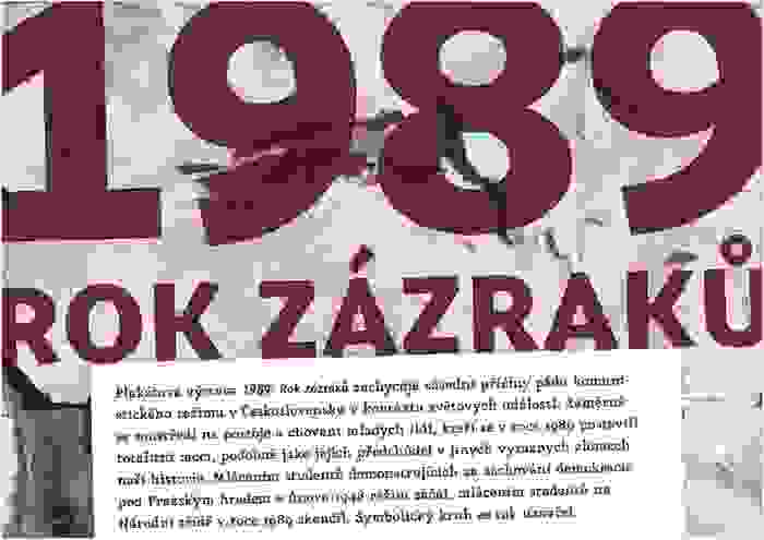 Plakátová výstava 1989: Rok zázraků zachycuje zásadní příčiny pádu komunistického režimu v Československu v kontextu světových událostí. Soustředí se na postoje a chování mladých lidí, kteří se v roce 1989 postavili totalitní moci, podobně jako jejich předchůdci v jiných výrazných zlomech naší historie.
