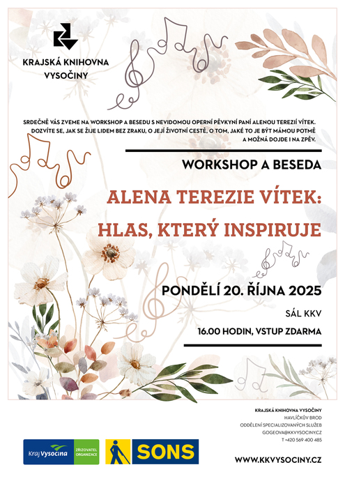 Srdečně vás zveme na workshop a besedu s nevidomou operní pěvkyní Alenou Terezií Vítek. Dozvíte se, jak se žije lidem bez zraku, o její životní cestě, o tom, jaké to je být mámou potmě a možná dojde i na zpěv.