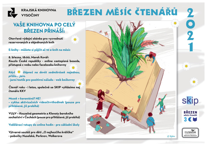 Krajská knihovna Vysočiny se již tradičně připojuje k celostátní akci Březen – měsíc čtenářů, kterou pořádá SKIP – Svaz knihovníků a informačních pracovníků ČR. I když vzhledem k stávající situaci probíhá většina akcí on-line, ani letos nebudou po celý měsíc chybět besedy, soutěž, testíky, přednášky a další aktivity: