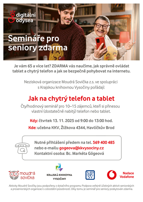 Je vám 65 let a více? Nezisková organizace Moudrá sovička z.s. ve spolupráci s naší knihovnou vás srdečně zve na čtyřhodinový seminář pro 10–15 zájemců, kteří si přinesou vlastní (dostatečně nabitý) telefon nebo tablet.