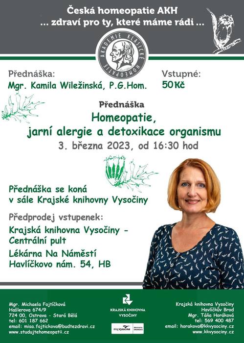 Srdečně Vás zveme na přednášku Homeopatie, jarní alergie a detoxikace organismu Mgr. Kamily Wiležinské, P. G. Hom.