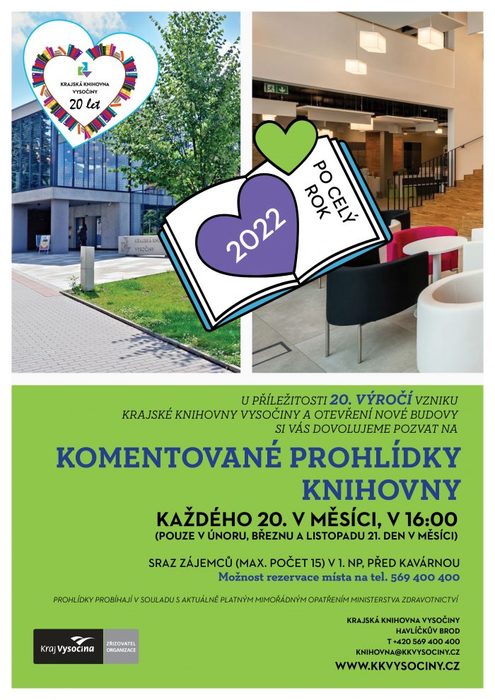 Při příležitosti 20. výročí založení Krajské knihovny Vysočiny se můžete každý měsíc těšit na komentované prohlídky, při kterých vám bude podrobně představena celá budova knihovny. Možnost rezervace míst na tel. čísle 569 400 400.