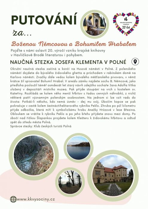 v roce 20. výročí založení Krajské knihovny Vysočiny se každý měsíc můžete těšit na výletní tipy, které propojí fyzickou aktivitu s duševní. Únor je zasvěcen Boženě Němcové a Bohumilu Hrabalovi.