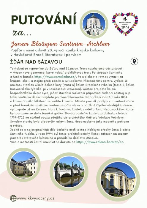 v roce 20. výročí založení Krajské knihovny Vysočiny se každý měsíc můžete těšit na výletní tipy, které propojí fyzickou aktivitu s duševní. Březen je zasvěcen Janu Blažeji Santinimu-Aichelovi.