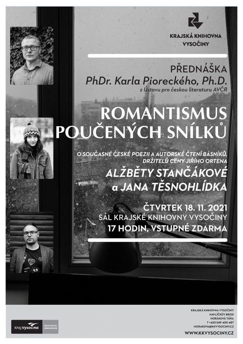 Krajská knihovna Vysočiny Vás srdečně zve na přednášku PhDr. Karla Pioreckého, Ph.D., v současné době vědeckého pracovníka Ústavu pro českou literaturu AV ČR, o současné české poezii s názvem Romantismus poučených snílků. Přednáška je spojena s autorským čtením současných mladých básníků, držitelů prestižní Ceny Jiřího Ortena, Alžběty Stančákové a Jana Těsnohlídka.