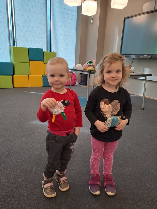 Malá holčička obmotává papírovou ovečku žlutou vlnou.