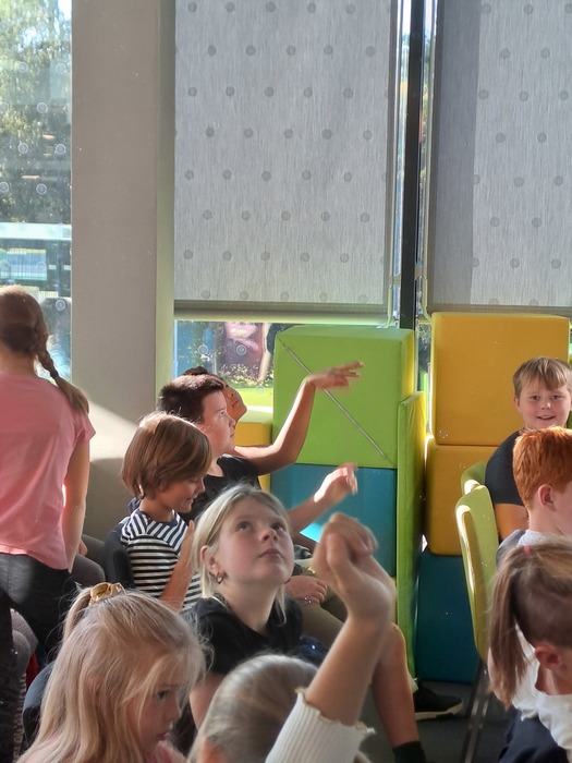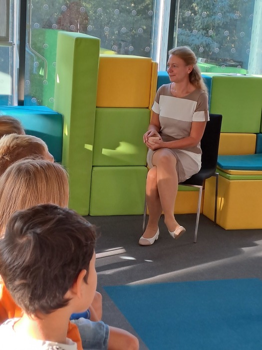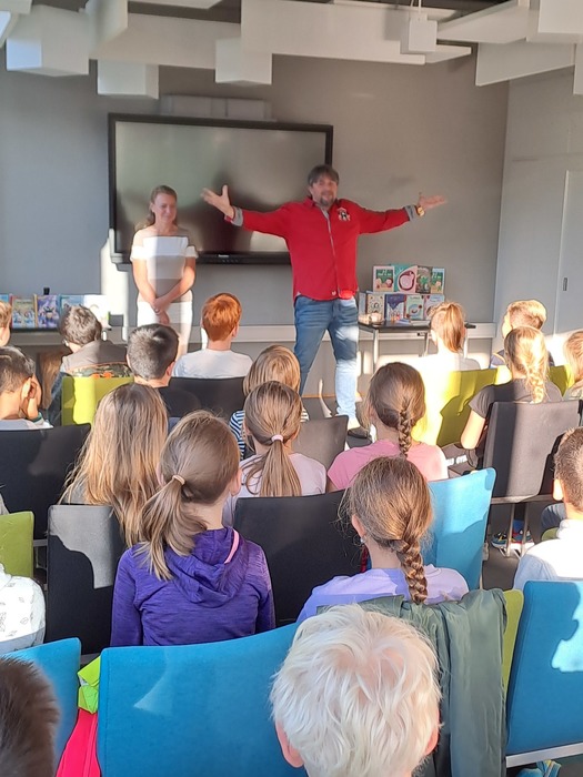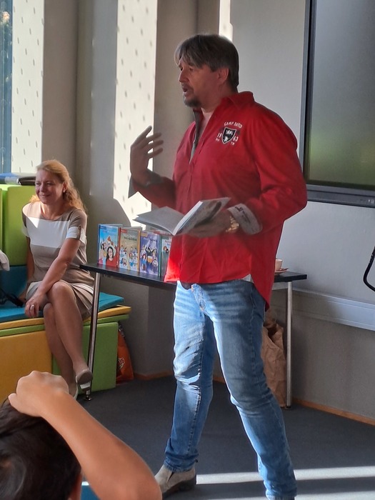 Miroslav Reil stojí před dětmi, v jedné ruce má knížku a druhou gestikuluje směrem k dětem. Za ním sedí u stolu Michaela Fišarová.