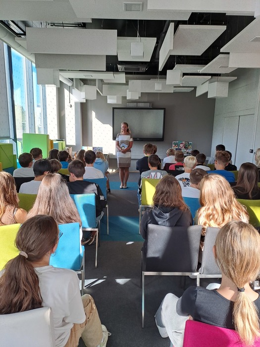Michaela Fišarová stojí před dětmi, které sedí na židlích v řadách za sebou, a v rukou drží knihu Nikolina cesta.
