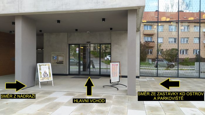 MHD – příjezd na zastávku KD Ostrov, po výstupu z autobusu se otočíte doleva a poté půjdete cca 100 metrů, příchod může handicapovaným uživatelům zkomplikovat přechod přes silnici vedoucí z/na parkoviště (cca 2 minuty)