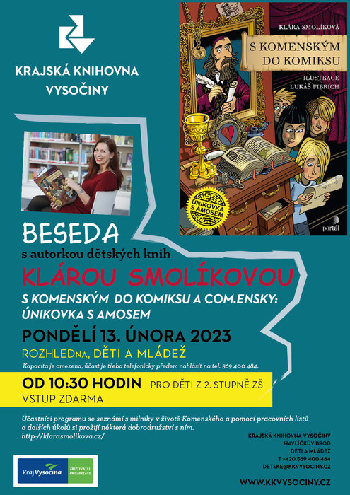 Oddělení Děti a mládež pořádá besedu se spisovatelkou Klárou Smolíkovou S Komenským do komiksu a Com.ensky: Únikovka s Amosem. Děti se v průběhu programu seznámí s milníky v životě Komenského a pomocí pracovních listů a dalších úkolů prožijí některá dobrodružství s ním.