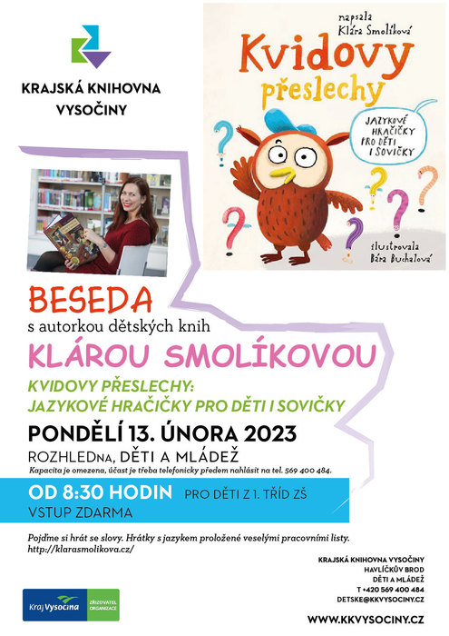 Oddělení Děti a mládež pořádá besedu se spisovatelkou Klárou Smolíkovou Kvidovy přeslechy: Jazykové hračičky pro děti i sovičky. Přijďte si hrát se slovy. Hrátky s jazykem proložené veselými pracovními listy.
