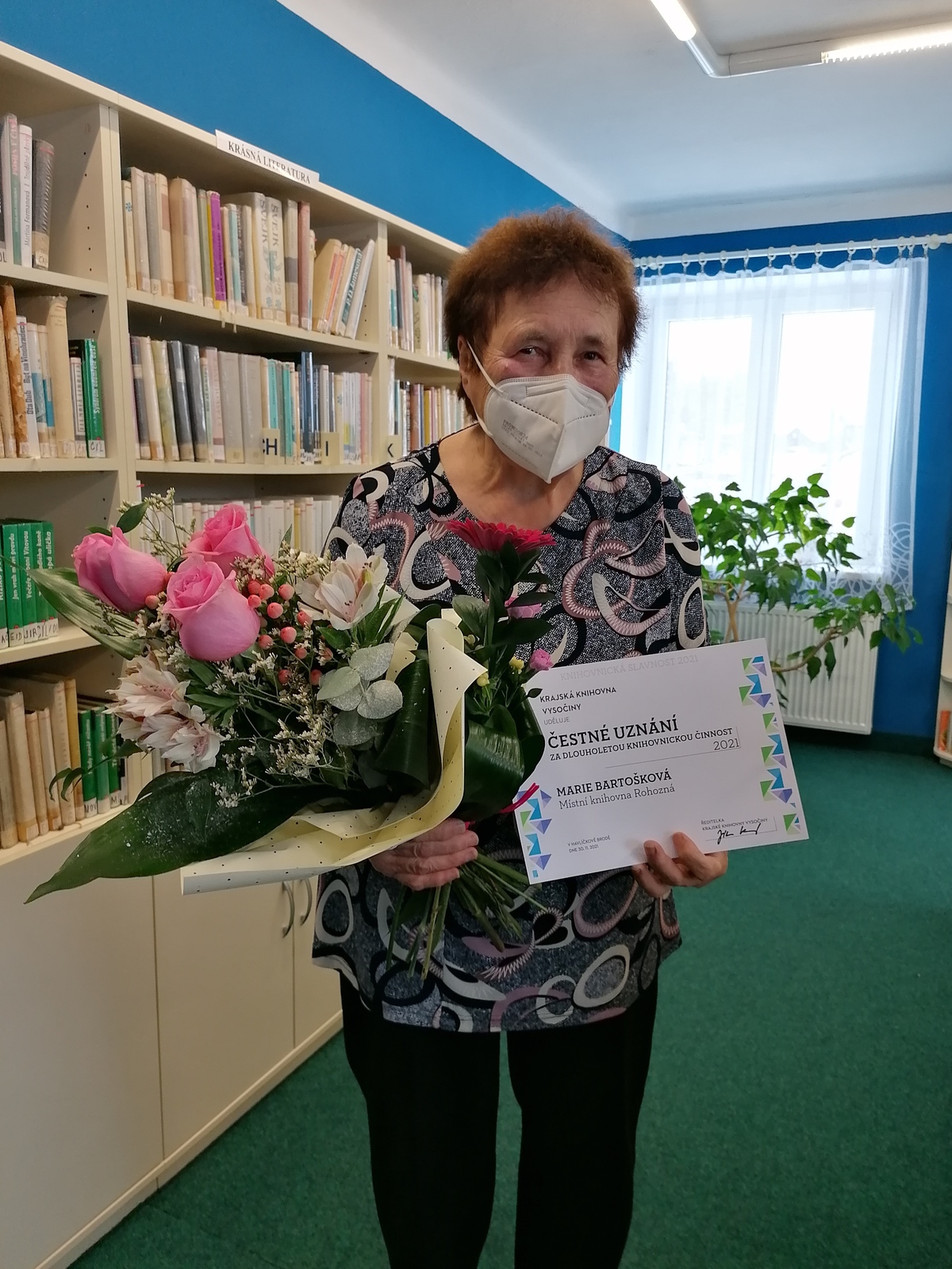 Jako další byla oceněna paní Marie Bartošková (Knihovna Rohozná), která vede knihovnu v Rohozné od září 1978, tedy 43 let. Od tohoto roku je knihovna nepřetržitě v provozu. Postupně byla modernizována a vybavena novým nábytkem. Knihovna umožňuje návštěvníkům nejen výpůjčku knih, ale nabízí příjemné posezení a čtení přímo v prostorách knihovny. Především starší čtenáři oceňují, že díky knihám, které do knihovny přiváží pracovnice z Útvaru regionálních služeb Městské knihovny Jihlava, mají stále co číst. Spolupráci s tímto oddělením kladně hodnotí i knihovnice, paní Bartošková, která tak může pravidelně každé úterý rohozenským čtenářům nabízet kvalitní knihy.