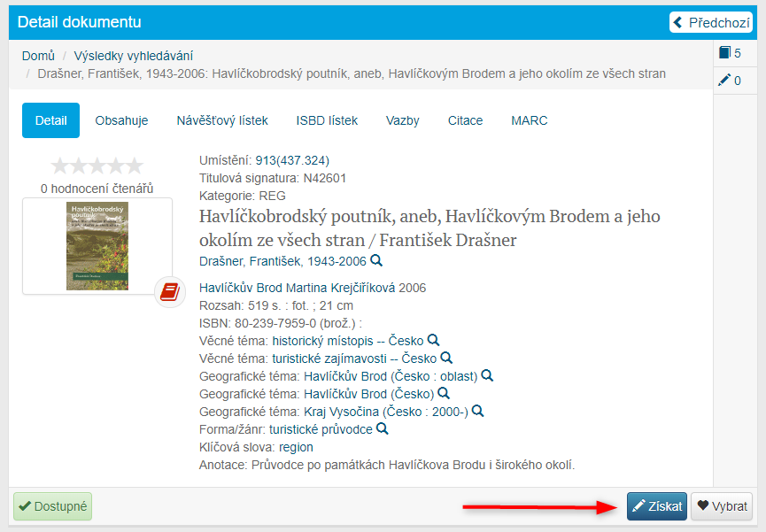 V katalogu máte možnost objednat si pro sebe knihu, a to několika způsoby. Vypůjčenou knihu si můžete rezervovat. Dostupnou knihu si můžete nechat odložit nebo objednat ze skladu, pokud je umístěna ve skladu. Všechny možnosti se vám zobrazí po stisknutí tlačítka „Získej“. Tato služba je dostupná po přihlášení do čtenářského konta.